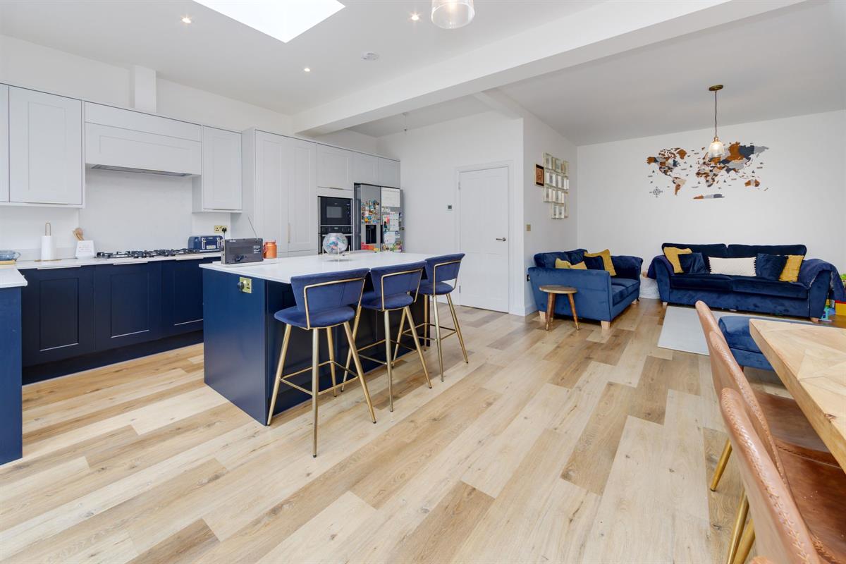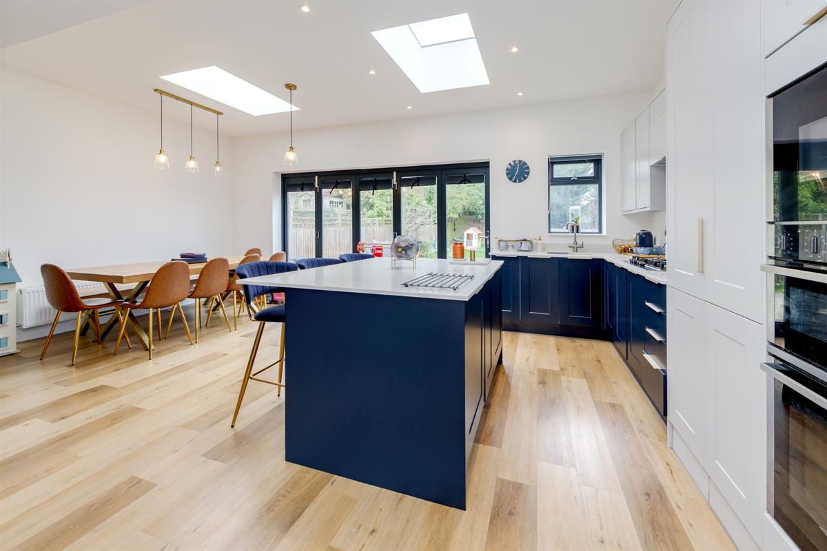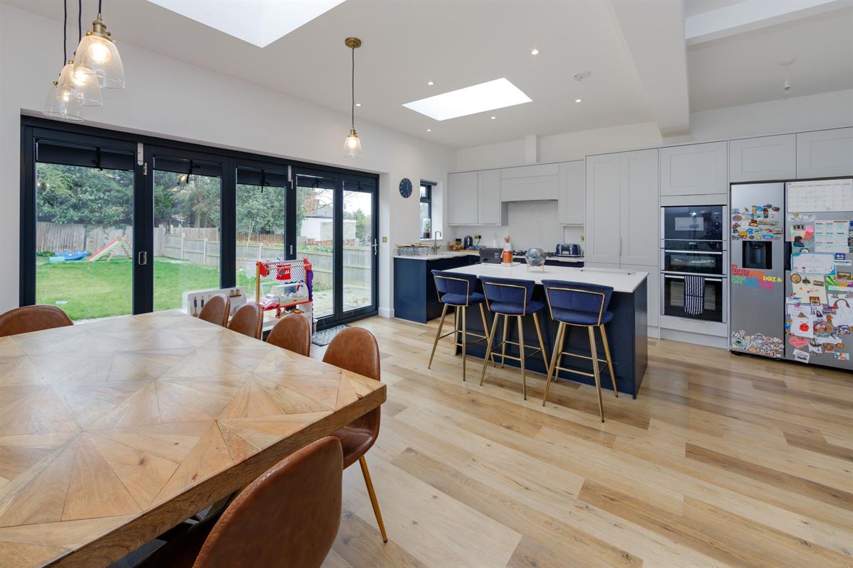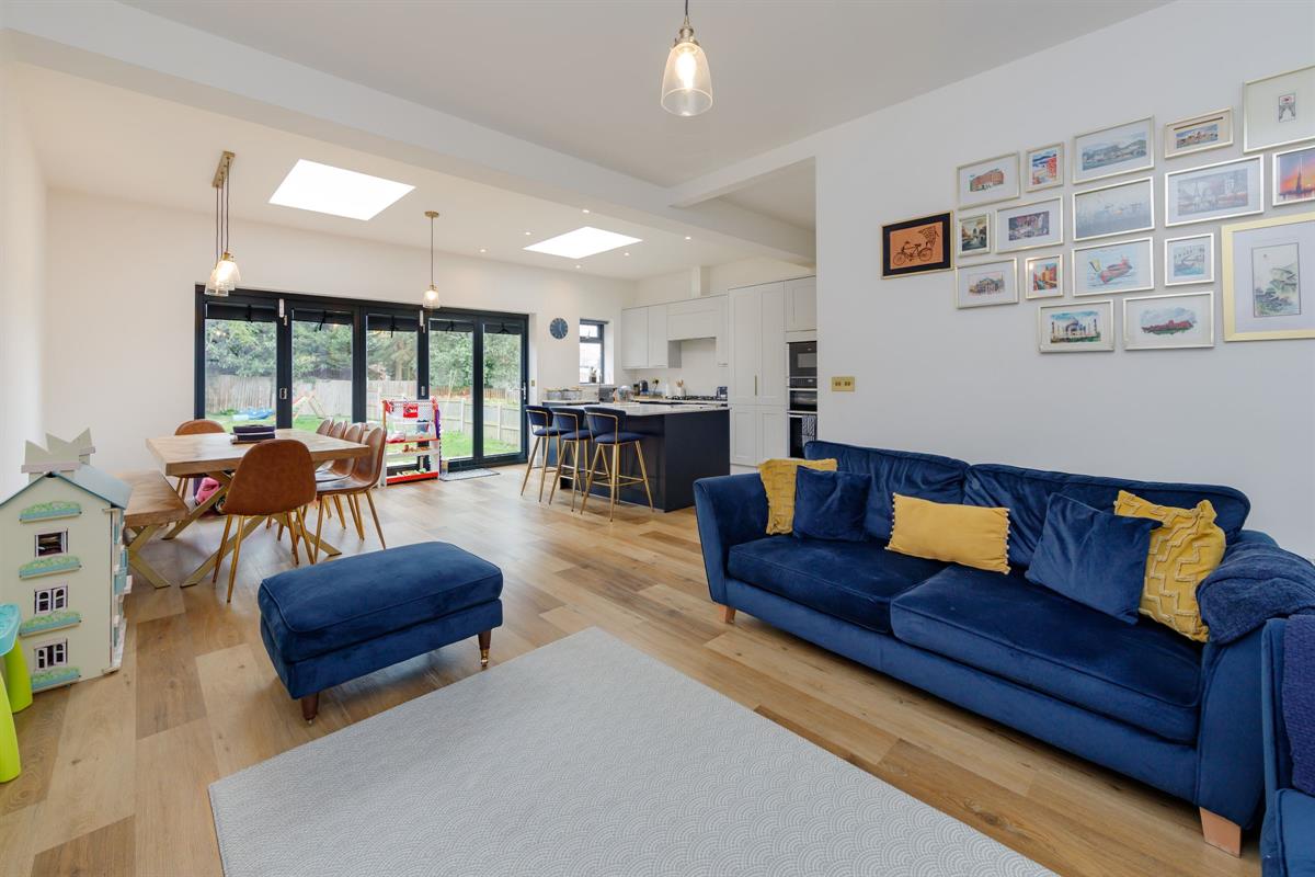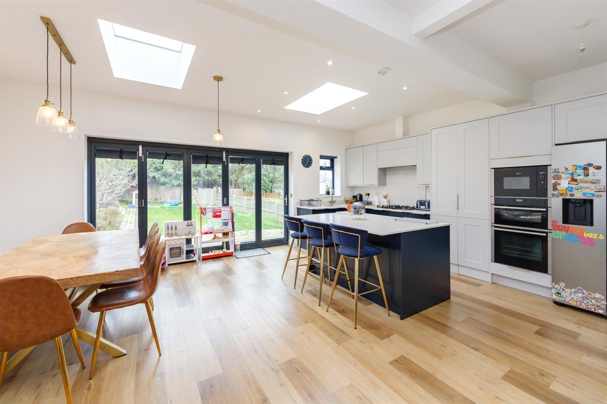 Open plan L-shaped room measuring 24'10 x 12'5 < 20'0 with fitted kitchen including island with two skylight windows and bi-folding doors to the rear garden. Within the kitchen units are hidden doors leading to a second kitchen.