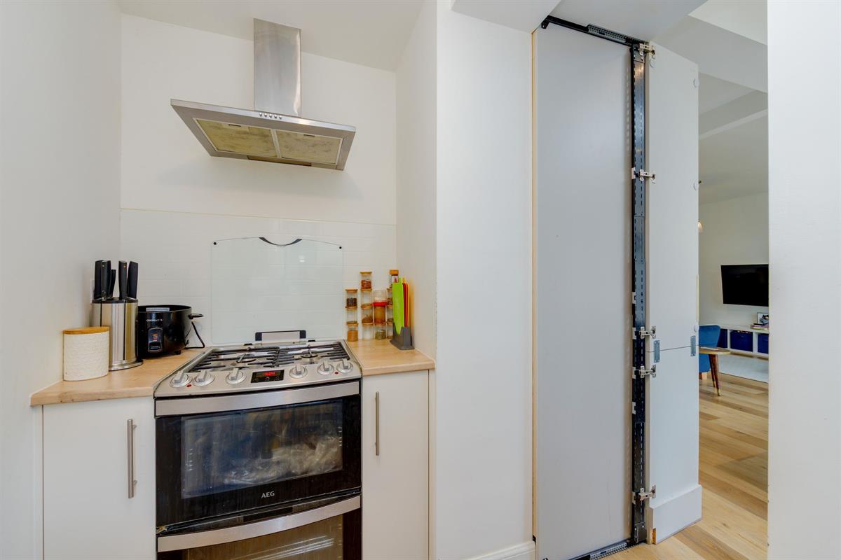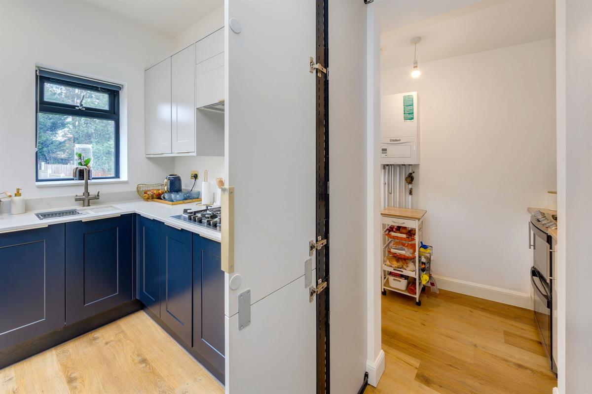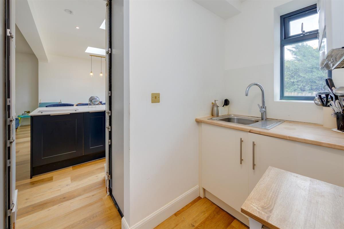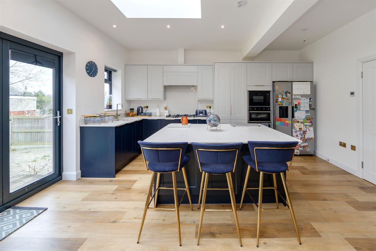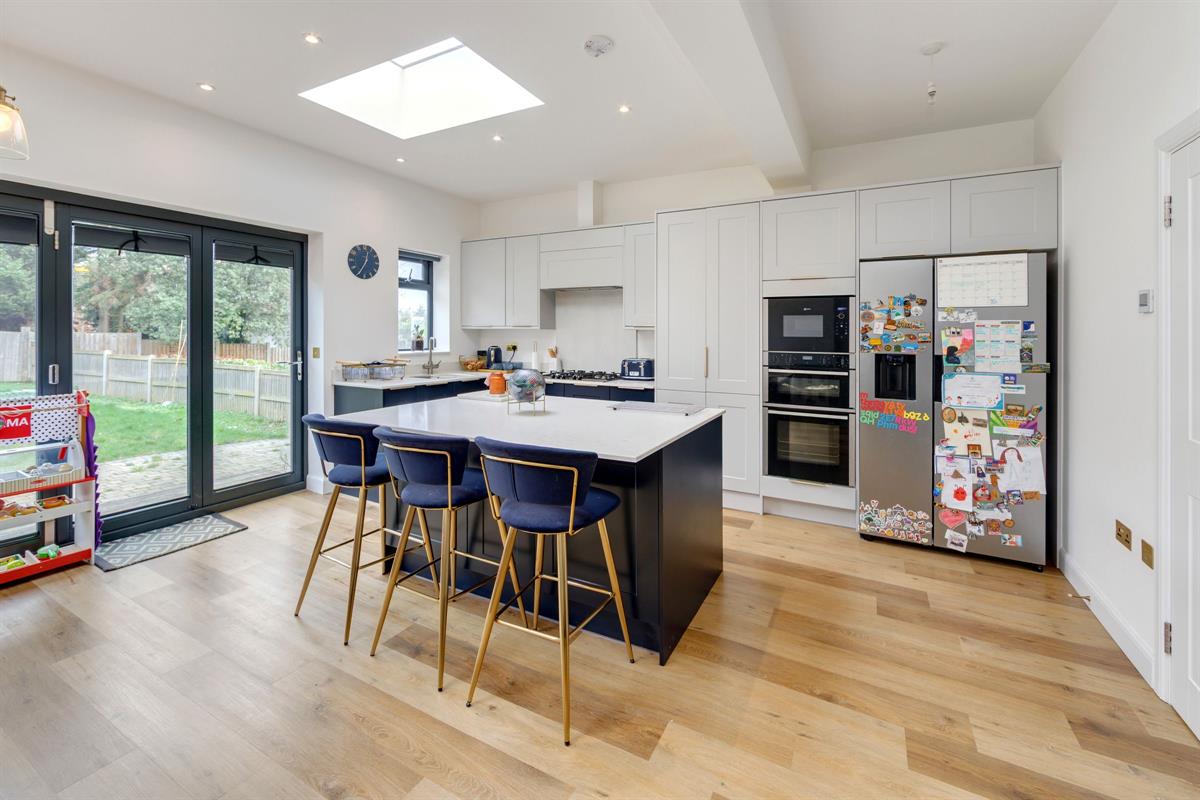 Open plan L-shaped room measuring 24'10 x 12'5 < 20'0 with fitted kitchen including island with two skylight windows and bi-folding doors to the rear garden. Within the kitchen units are hidden doors leading to a second kitchen.